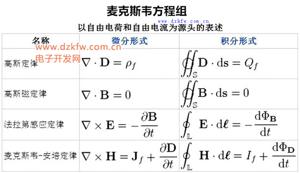 天線所發射或接受的無線電波是一種能量傳輸形式,即電磁波。在傳播過程中,電場和磁場在空間上相互垂直,同時這兩者又垂直于傳播方向。 電磁場三維圖: 電磁波傳播平面圖: 英國物理學家詹姆斯·克拉克·麥克斯韋在19世紀通過數學推導建立了一組描述電場、磁場與電荷密度、電流密度之間關系的偏微分方程。