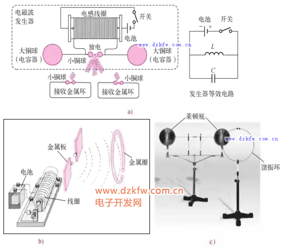 a)赫茲的實驗裝置(電磁波發生器+接收器)原理圖 b)通電線圈產生電磁波