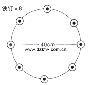 為了繞制長(zhǎng)波線圈,可在一塊木板上,劃一40cm的圓環(huán),再按等弧距釘上8根一定長(zhǎng)度的鐵釘,構(gòu)成簡(jiǎn)單的框架,如圖所示。圍繞著框架,細(xì)心地用漆包線繞上1000匝線圈,完成之后用絕緣帶繞上,以保護(hù)線圈,然后把鐵釘去除,即可獲得完整的線圈,再把所得線圈固定到一木盒內(nèi)。