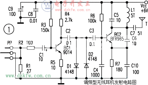 圖中示出的是調頻型無線耳機發射電路圖 FM wireless headset transmitter circuit