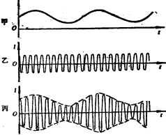 右圖是調幅裝置的示意圖.接在振蕩器和線圈之間的話筒就是一個最簡單的調制器,由聲源發出的聲音振動使話筒里的碳粒發生時松時緊的變化,它的電阻也發生時大時小的變化。所以,雖然振蕩器產生的是高頻等幅振蕩電流,但是線圈通過的卻是隨聲音而改變的高頻調幅電流.由于線圈的互感作用,從開放電路中發射的也是這種高頻調幅電流。這種電磁波叫調幅波。