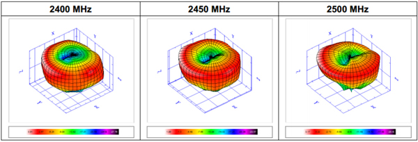 天線都有方向性,指的是天線對空間不同方向具有不同的輻射或接收能力。衡量天線方向性通常使用方向圖,錯誤!未找到引用源。所示是一個頻率范圍從2400MHz到2500MHz天線的方向圖。