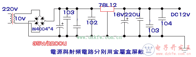 電路原理現(xiàn)見附圖。圖(1) 為電源部分,將市電降壓整流后再加以穩(wěn)壓,獲得穩(wěn)定的12V直流電供射頻電路使用。射頻電路由高頻振蕩器、緩沖放大器、末級功率放大器及天線組成。高頻振蕩器用來產(chǎn)生載頻信號,頻點落在88--108MHZ內(nèi),并完成頻率感量即可改變發(fā)射頻率。射頻信號由VT1的發(fā)射極輸出,送到VT2、L2、C22、R4等組成的緩沖放大器進行功率提升,并可減輕末級放大電路對振蕩器的影響。末級為高頻率丙窄帶放大,對射頻功率再進一步放大,經(jīng)C25耦合到發(fā)射天線向周圍空間輻射。所駁接的音源若輸出信號幅度過大時,需串入衰弱電阻,以免聲音失真。