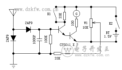 本電路是一個簡易的場強儀,對于微功率的信號非常靈敏,由于本電路僅作相對場強比較,所以并沒有一個標(biāo)準(zhǔn),但用來調(diào)試設(shè)備卻是非常方便的。可以直接用探頭點測調(diào)制器的輸出端,也可以用探頭點測激勵級的輸出。