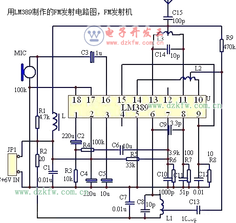 下圖為用美國NS公司的集成電路制作的一款遠程無線發射電路,不難看出,實際上就是利用它的音響放大部分作為話筒的音頻放大,然后利用1腳輸出的音頻信號來調制后級的高頻振蕩部分,高頻振蕩就利用它內部的高頻三極管來完成。它配合良好的調頻收音機可以發射1KM的距離,電路中的電感用直徑0.50mm的漆包線繞成直徑6mm的空心線圈,其中心抽頭.具體是L1,L3均為6匝,中心抽頭. L2為3匝,中心抽頭.其性能要比晶體管制作的電路較穩定.以下是實際制作的圖片和電路原理圖.愛好者可以自已動手制作。