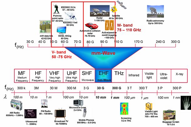 當前,隨著5G、汽車雷達、安檢成像、無線HDMI、深空探測等諸多毫米波領域的應用已經日臻成熟,相應的產品陸續面世,從毫米波乃至太赫茲器件研發到整機生產對的測試方案也提出了新的要求。下圖匯集了所有的毫米波應用,直觀的呈現了熱點毫米波應用的頻段分布。