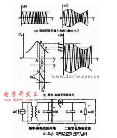 以斜率鑒頻器為例,如圖所示,圖(a)是諧振回路的輸入電流與輸出電壓。圖(b)是其中的頻率一振幅變換原理。圖(c)為單失諧回路鑒頻器原理圖。