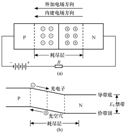光生載流子在外加負偏壓和內建電場的作用下,在外電路中出現光電流,如圖3-38(a)所示.從而在電阻R上有信號電壓輸出.這樣,就實現了輸出電壓跟隨輸入光信號變化的光電轉換作用.所謂負偏壓是指P接負,N接正。