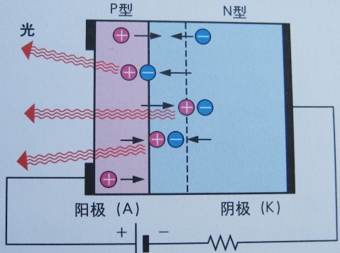 LED是具有PN接合面的半導體。外加正向電壓的話,電子將從N型區域,空穴將從P型區域向PN接合部分移動后再結合,電子帶來的能量就轉換為光。也就是說,自由電子和空穴進入結合狀態時所產生的能量變成光后放射出來。