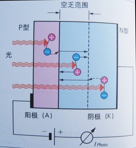 一旦光射入PN接合二極管,結合在晶格內的電子被解放,成為自由電子,會產生一對自由電子及空穴。反向電壓引發的空乏層內,或者其附近由于光的照射而產生的自由電子和空穴對將會會離,成為強度與光的強弱成比例的反向電流。這就叫光電流。空乏層以外的區域產生的自由電子和空穴對會再次接合成為熱,并消失。