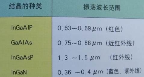 光的顏色(光的波長)由半導體的種類和添加物決定,各種化合物半導體的用法如下。