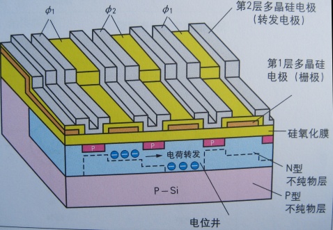 CCD具有形成于基板表面的N型不純物層的上面像鏈條一樣并排多個MOS型電極的結構。轉發電極是重合2層或3層多晶硅的結構,盡可能縮小電極和電極的間隔形成。沿著排放的轉發電極,施加以時鐘脈沖的話,存在于電極之下的電荷將按順序向旁邊的電極之下移動。