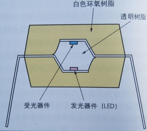 安裝在個別框架內的發光器件(一般情況下為紅外線LED)和受光器件在光結合的狀態下放置,并且彩絕緣性的樹脂塑膜定型。