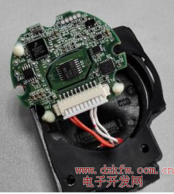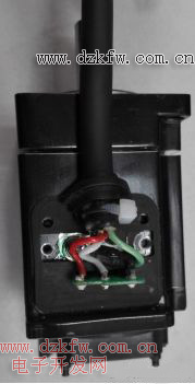 先來看右側的編碼器,編碼器與電機是非接觸的,總共有四根導線引出。通過中間的傳感器來獲取電機運行參數。下面是編碼器線路板的正面和背面。