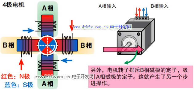 如上圖所示,電機(jī)的運(yùn)動是通過改變電流在電機(jī)中的流動來實現(xiàn)的,電子轉(zhuǎn)子排斥B相磁極的定子,吸引A相磁極的定子,這就產(chǎn)生了另一個步進(jìn)操作。