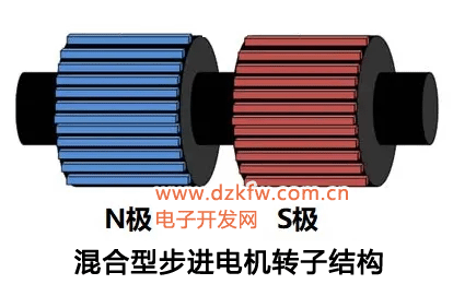 顧名思義,混合式步進(jìn)電機(jī)結(jié)合了永磁式和反應(yīng)式步進(jìn)電機(jī)的優(yōu)點(diǎn),它的轉(zhuǎn)子采用永磁性材料,并且將其分成南極(S極)和北極(N極)兩個(gè)部分,每個(gè)部分又有很多的齒狀結(jié)構(gòu),如下圖所示: