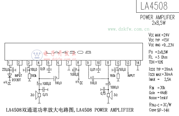 LA4508雙通道功率放大電路圖,單電源15V電壓工作,輸出功率8.5W。