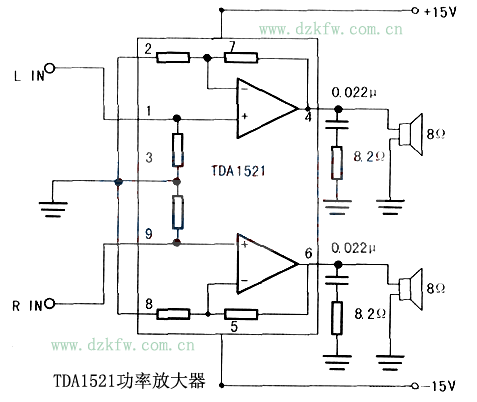 (1)TDAl521電源一定不要接反,否則將燒毀電路。