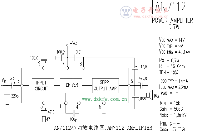 AN7112小功放電路圖,AN7112 AMPLIFIER ,輸出功率0.7W,可做收音機(jī)功放。