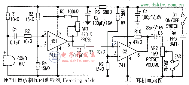 附圖的助聽器電路,具有高靈敏度,低功耗、低價位和重量輕等特點。音頻信號由電容話筒檢測再用741IC組成的兩級運算放大器進行放大。第一級IC741(IC1)組成高增益放大器,而第二級IC741(IC2)作低增益的中等功率放大器,以驅動耳機(earphone)。使用一只470kΩ(VR1)的可調電阻以控制信號的增益,而使用1kΩ(VR2)的可調電阻作輸出電壓控制器。