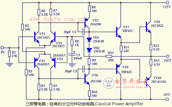 采用三極管放大電路構成的經典的分立元件功放電路,Classical Power Amplifier