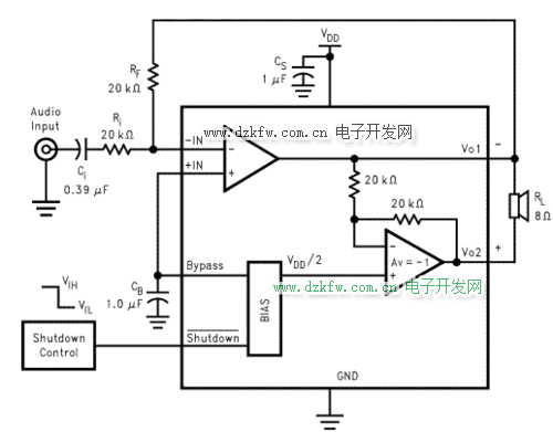 LM4889是一款主要應(yīng)用于手機的音頻功率放大器。5V電源時,它能夠提供1瓦的連續(xù)平均功率輸出(8Ω橋式連接負載),失真小于2%(THD+N)。LM4889需要的外部元件極少,不需要輸出耦合電容器或啟動電容器,因此適合移動電話和其他低電壓應(yīng)用。該LM4889具有低功耗的停機模式、內(nèi)部誤關(guān)斷保護機制、噪音消除功能,可以配置外部的增益設(shè)定電阻。LM4889典型應(yīng)用電路: