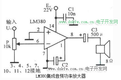 LM380集成音頻功率放大器的應(yīng)用電路如下圖所示: