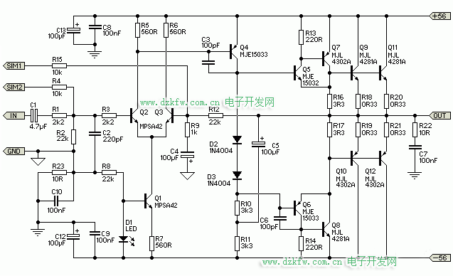 選用MJL4281A(NPN)和MJL4302A(PNP),具有高帶寬,良好的SOA(安全工作區(qū)),高線性和高增益。驅(qū)動晶體管選用MJE15034(NPN)和MJE15035(PNP)。所有器件的額定電壓為350V。輸出三極管選用MJL4281A(NPN)和MJL4302A(PNP),具有高帶寬,良好的SOA(安全工作區(qū)),高線性和高增益。驅(qū)動晶體管選用MJE15034(NPN)和MJE15035(PNP)。所有器件的額定電壓為350V。性能指標:8Ω4Ω電壓增益27dB27dB功率(連續(xù))153W (240W)240W (470W)峰值功率 - 10 ms185W (250W)344W (512W)峰值功率 - 5 ms185W (272W)370W (540W)輸入電壓1.3V (2.0V) RMS1.3V (2.0V) RMS噪聲 *-63dBV (ref. 1V)-63dBV (ref. 1V)S / N比 *92dB92dB失真0.4%0.4%失真 (@ 4W)0.04% (1 Khz)0.04% (1 Khz)失真 (@ 4W)0.07% (10 kHz)0.07% (10 kHz)擺率》 3V/us》 3V/us300W音頻功率放大器電路原理圖