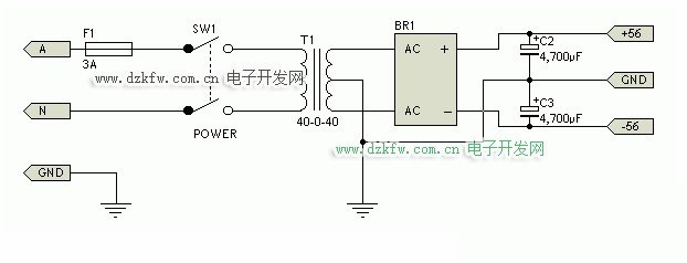 這款功放一聲道只需17個零件,卻收到了意想不到的效果,還音效果真實,頻響平直,解析力高,且功率可以達到50W。此功法電路可謂一裝即成,特別適合初學者制作。具體電路如圖(只畫出一聲道),全機用1/2W電阻,C2和C4用瓷盤電容即可,Q5、Q6采用大功率管2SC5200,變壓器容量大于200W,次級輸出電壓AC22V*24A。