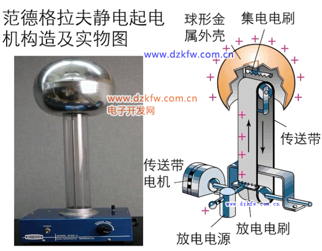 范德格拉夫起電機是由美國科學家范德格拉夫 (1901- 1967) 于1931年發明的。起電機以摩擦生電的原理,不斷產生大量電荷。圖為學校普遍使用的一種模型,內里有一條橡皮帶,由膠轆帶動運轉。當點電極藉摩擦或高電壓產生靜電,運轉的橡皮帶便會將電荷不斷地傳到球形金屬罩的內表面。因為電荷之間互相排斥,所以電荷便移動到球形罩的外表面,形成大量電荷積聚在球形罩上。
