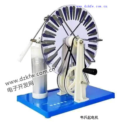 三、起電機應用在歷史上,維姆胡斯起電機曾經是產生高電壓的重要工具,現在則主要用于課堂演示靜電現象及空氣中的放電現象。一對約60厘米直徑的玻璃盤以 100轉/分的速度旋轉,大約可以產生50000伏的電壓。大型的維姆胡斯起電機可以在空氣中產生十多厘米長的電弧,同時發出強烈的噼啪聲。