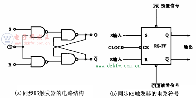 與時鐘信號同步工作。圖 (a)所示是同步RS觸發(fā)器的電路結(jié)構(gòu),它將兩個輸入端用了兩個與非門,