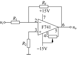在反相比例運算電路中,電路輸入信號ui總是經過一個電阻R1接到反相輸入端,輸出信號uo經過一個電阻RF反饋到反相輸入端,如圖1(a)所示。由圖可見,圖中電路是一個用國產芯片F741接成的反相比例運算電路,圖中同時給出了電源連接及調零電路,并在同相輸入端對地串了一個電阻R2=R1//RF,目的是使兩個輸入端對地的等效電阻相同。需要強調的是,今后除特殊情況外,電源及調零等電路均為默認,不再畫出,從而圖1(a)所示電路簡化為圖1(b)所示。