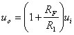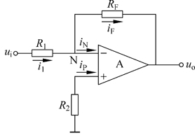 上式表明,反相比例放大電路的電壓放大倍數僅取決與反饋電阻RF與輸入電阻R1之比。式中負號“—”表示輸出電壓的相位與輸入電壓相位相反,即“反相”。