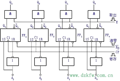 時,則反之。當加“取出指令”(正脈沖)時,則將4個與門開通,其輸出端即為所存二進制數