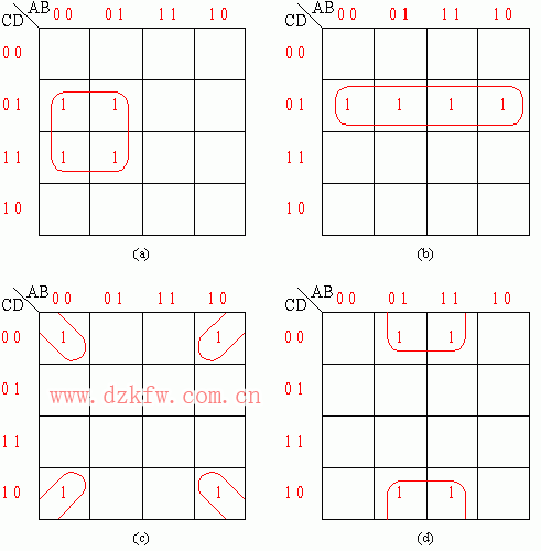 四變量卡諾圖由16個最小項m0—m15組成,每個最小項占一個方格;縱向方向因有兩個變量CD,增加了8個方格,CD變化規律同AB;原變量與非變量各占8格。(http://www.tsxfzk.com/版權所有 )