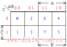 AB組合中左數位代表A變量,右數位代表B變量。沿橫向從一個方格進行到下一個方格時,兩個數位只變化一個; 原變量與非變量各占4格。