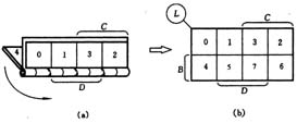 )。因為變量C的標法必須區別于D,這樣就有兩種可能的標法,可以標在展開前方格的頂上,也可標在展開后新的兩個方格的頂上,圖(b)采用后一種標法,以保持左邊的第一格仍為m0項,即維持展開前兩方格最小項序號不改變。由圖2(b)可看到一個規律:新的方格內最小項的編號比對應的原方格增加了2n-1=22-1=2。按照這個規律折疊圖2(a)時,方格1后面為方格3,方格0后面為方格2,展開后即得圖2(b)所示的2變量卡諾圖。