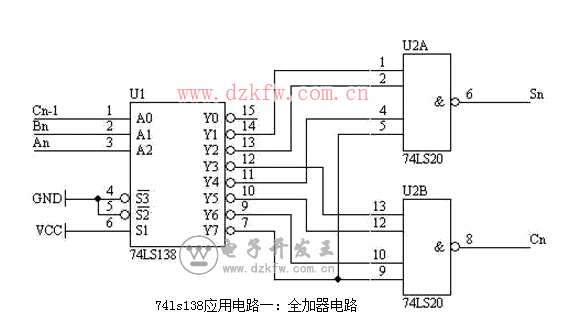 將3-8譯碼器的輸出OUT(1、2、4、7)作為一個4輸入的或門的輸入,或門的輸出作為加法器的和;將3-8譯碼器的輸出OUT(3、5、6、7)作為一個4輸入的或門的輸入,或門的輸出作為加法器的進位輸出。當加法器的輸入分別為:a=1,b=0,ci=1時,對應3-8譯碼器的輸入為A=1,B=0,C=1,這是譯碼器對應的輸出為OUT(5)=1,其余的為0,根據上面設計的連接關系,s=0,co=1,滿足全加器的功能。