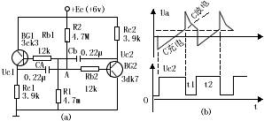 | 結果使BG1、BG2截止,接著CA、CB又進行充電,如此重復。就可獲得如圖3(b)的輸出脈沖波,設電路對稱,即CA=CB=C,Rb1=Rb2=Rb,R1=R2=R,Rc1=Rc2=Rc脈沖寬度為: t1=c(Rb+rbe)In{Ec/[Ubes+(Ec/Rb)Rc]} t2≈0.7Rc 選擇晶體管的β應滿足Rb<βRc,根據圖3(a)電路的參數可算出t1=10毫秒,t2=750毫秒,占空比(t1/t2)=75. |