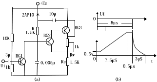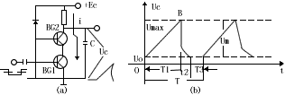 | 圖1是(a)是恒流源鋸齒波電路,BG1是開關管,由輸入矩形脈沖控制其飽和與截止,BG2是共基恒流管,因此,當BG1截止時,BG2以恒定電流i對C充電,電壓uc線性地增長;當BG1飽和時,C通過BG1快速地放電,從而產生鋸齒波如圖1(b)示。 |