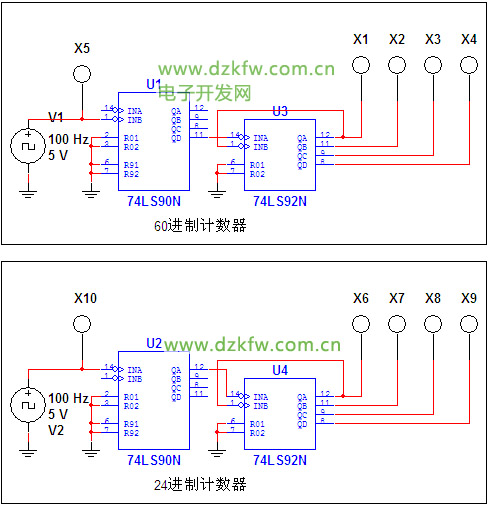 方案二:由74LS90和74LS92組成的六十進制計數器