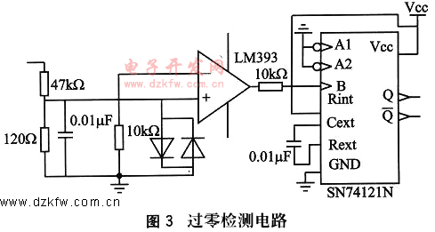 電壓經過電阻分壓和濾波,通過LM393構成的過零比較電路得到與電網輸入相電壓信號同步的方波信號,經過SN74121N變成和方波同步的觸發脈沖,隨后被送到DSP控制芯片的捕獲接口,用來產生邊沿捕獲信號以觸發相應的中斷,從而調用相應的中斷服務子程序。過零檢測電路: