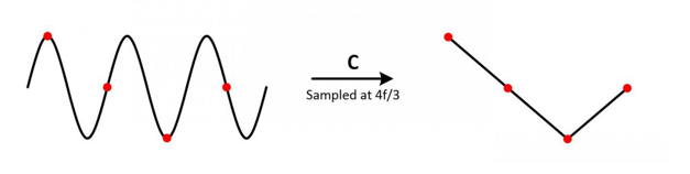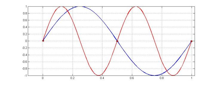 對于這三個點,我們不能確定它對應的正弦曲線是sin(2π/t),因為sin(4π/t)等倍頻曲線也會穿過這三個紅色采樣點:
