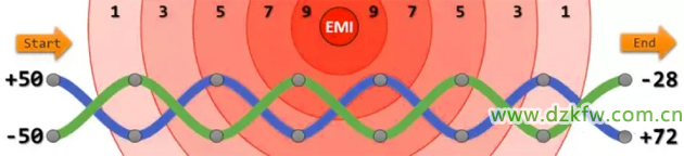 噪聲源通過電場或磁場的耦合將噪聲引入到導線中,并傾向于均等地同時耦合到兩條彼此扭曲的導線上。 這樣一來,噪聲就會在雙絞線上產生一組共模的信號。由一條導線產生的干擾/噪聲將會與另一根導線產生的干擾/噪聲相互抵消,因為它們本質上是大小相等且方向相反的,當差分信號被接收時,在接收器處就會被消除掉,最終得到純凈的沒有干擾的信號。