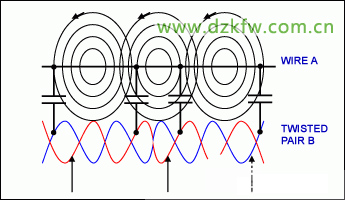 多個電路通過兩條線連接——一條直通線和一條返回線,構成一個金屬線導電回路。當金屬線導電回路置于其它電路附近時,如果周邊電路在兩條線上感應信號不同,則金屬線所連接的電話及其它電氣設備就會感應干擾信號;顯而易見,如果在直通線和返回線上產生相同影響,則其中一條導線產生的電流將抵消另一條導線產生的電流。如果兩條導線與干擾電流的感應關系相同,或將兩條導線置于與上述電路相同的距離(確保其它條件完全相同),則可避免干擾3。