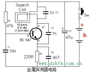 這個電路有點像是一個“電容三點式”振蕩電路,在三極管集電極上流過的是固定頻率的交變電流,遇到金屬后,線圈就會對金屬產生一定的吸力,從而探測發現金屬。​這個電路采用LC正弦波震蕩器電路(電容三點式),可以產生幾十兆赫茲的頻率。電路的振蕩頻率由L、C2、C3、C4決定.C1作為交流接地用。在電感上諧振。這里電路中只畫了金屬探測的探測部分。并沒有檢測電路。假設當L靠近金屬時。由探測線圈感應出高頻電壓經過高頻震蕩器檢波到放大部分。最后有喇叭輸出指示有金屬。頻率F=1/2π根號LC。​而對于震蕩,在晶體管電路分析中,有一種交流等效法,看三極管的三只腳上面是否都接了電容,而且是環接狀,不同的電容充放電就滿足了振蕩的基本條件,如果波特圖中畫出的相移大于135度,則振蕩就可以持續下去。這圖中,通電的瞬間,C1、C2、C3導通并開始充電,C1容量大,電壓后建立起來,到達一定值時三極管導通,C3上的電壓下降、C4上的電壓上升,三極管截止,C1再次開始充電、感應線圈中有電流流過,C3也再次充電,C4上的電壓通過并聯的電阻放電,e極的電壓開始下降,降到三極管正偏、C1上的電壓上升時,三極管再次導通,如此循環。