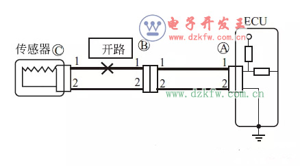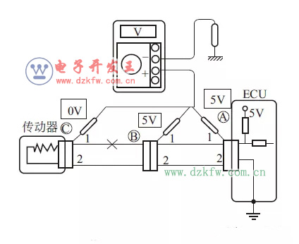 在微機(jī)連接器端子加有電壓的電路中,可以用檢查電壓的方法來檢查斷路故障(下圖)。在各連接器接通的情況下,電控單元輸出端子電壓為5V的電路中,如果依次測(cè)量連接器Ⓐ的端子1、連接器Ⓑ的端子1和連接器Ⓒ的端子1與車身(搭鐵)之間的電壓,測(cè)得的電壓值分別為5V、5V和0,則可以判定在Ⓑ的端子1與Ⓒ的端子1之間的配線有斷路故障。