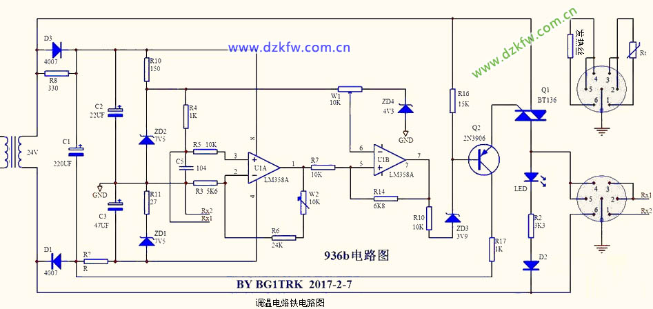 Rx上的電壓被第一個 LM358放大,放大倍數由微調電阻 VR2控制。再進入第二個 LM358進行電壓比較。 ZD2和 ZD4之間提供設定電壓,由電位器 W控制。我們通過調節 W,來設定焊臺的溫度。溫度低時, Rx 上電壓不高,第二個 LM358輸出為負電壓, Q2導通, BT137 導通,對芯加熱。達到設定溫度時,第二個 LM358輸出為正電壓, Q2截止,BT1 37 截止,停止加熱。注意,這里 ZD2和 ZD1給 LM358提供正負電壓,相當于是雙電壓供電, ZD2 的正極可認為是零點。 R8的作用是:觸發 BT137導通。C2上的電壓通過 R8、BT137的 T1 端、BT13 7 的 G端、Q2、R17,再回到 C2,這樣使 BT137控制端 G導通,從而 BT137的 T2、 T1端得以導通。