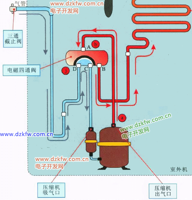 冷劑在壓縮機中被壓縮,將原本低溫低壓的制冷劑氣體壓縮成高溫高壓的過熱氣體,由壓縮機排氣口排出。高溫高壓的過熱氣體從電 磁四通閥A口進入,從 D口流入到蒸發器中。
